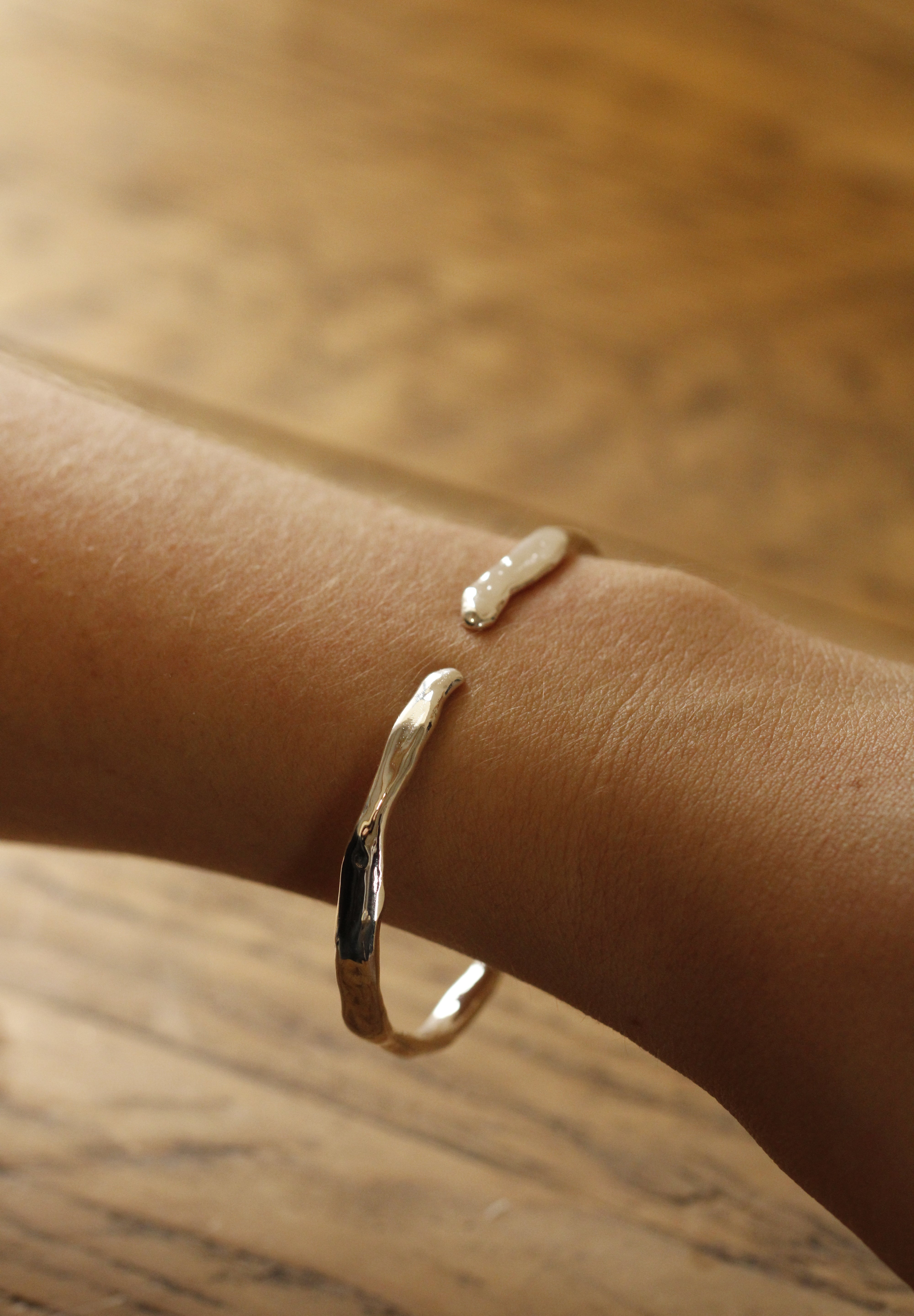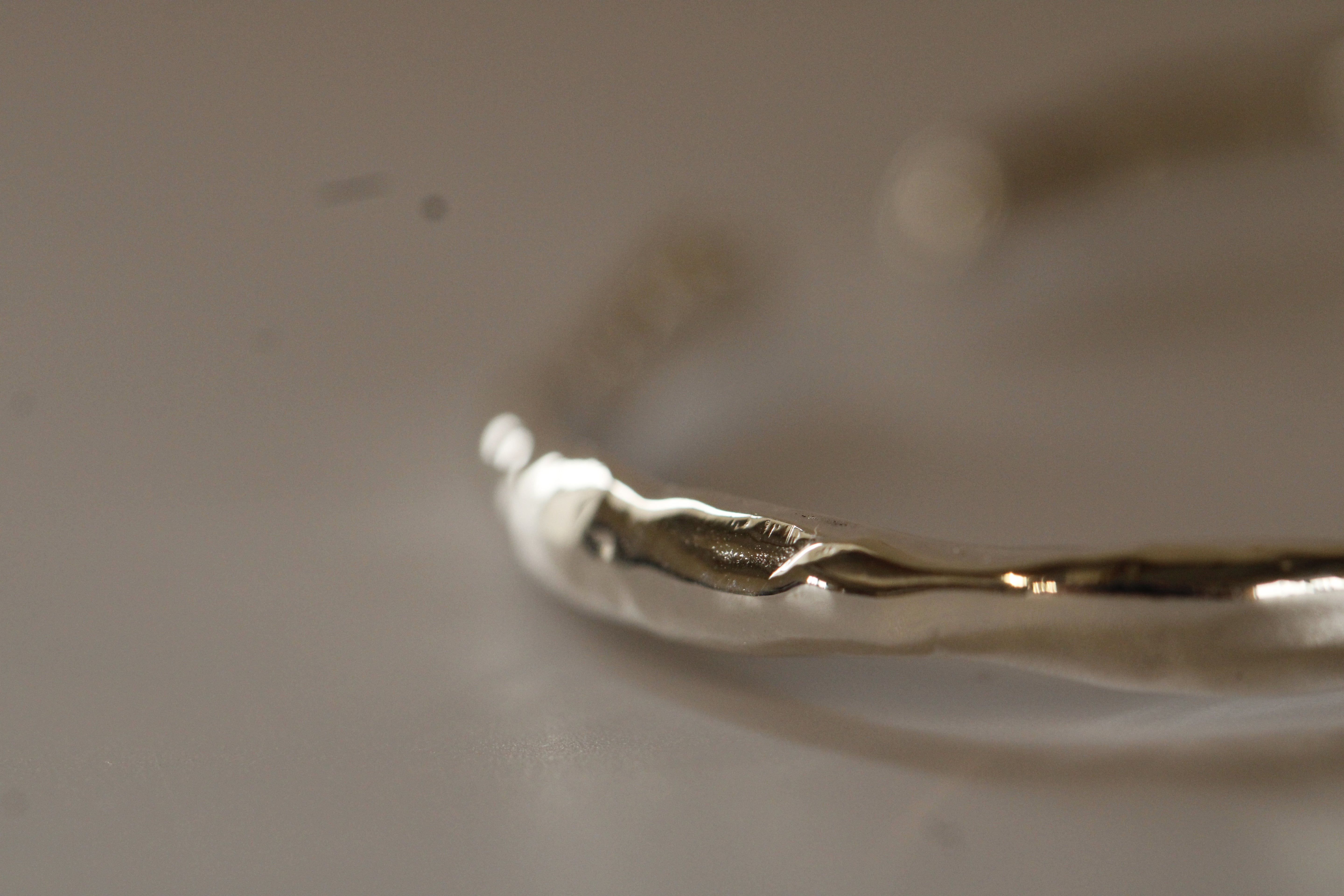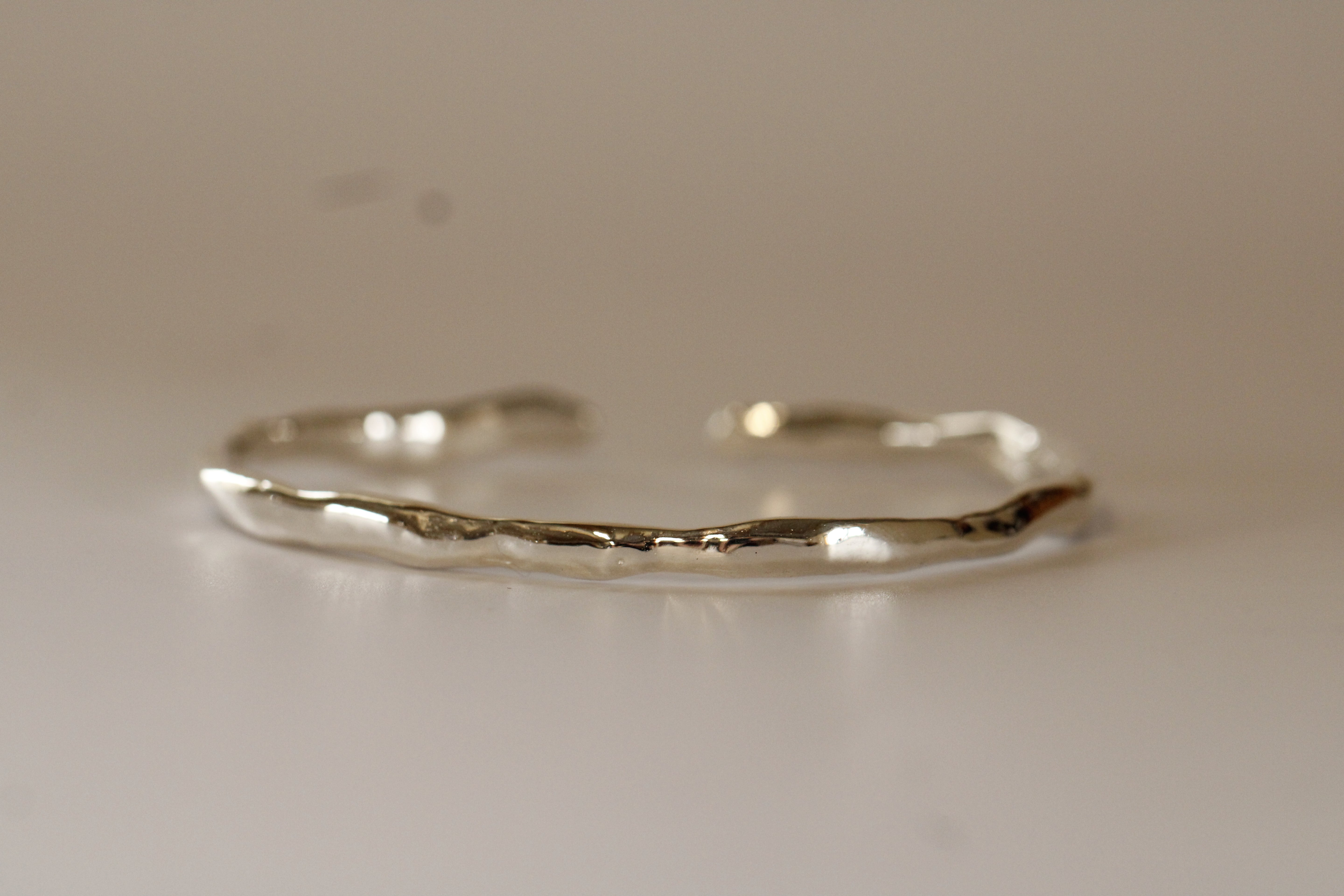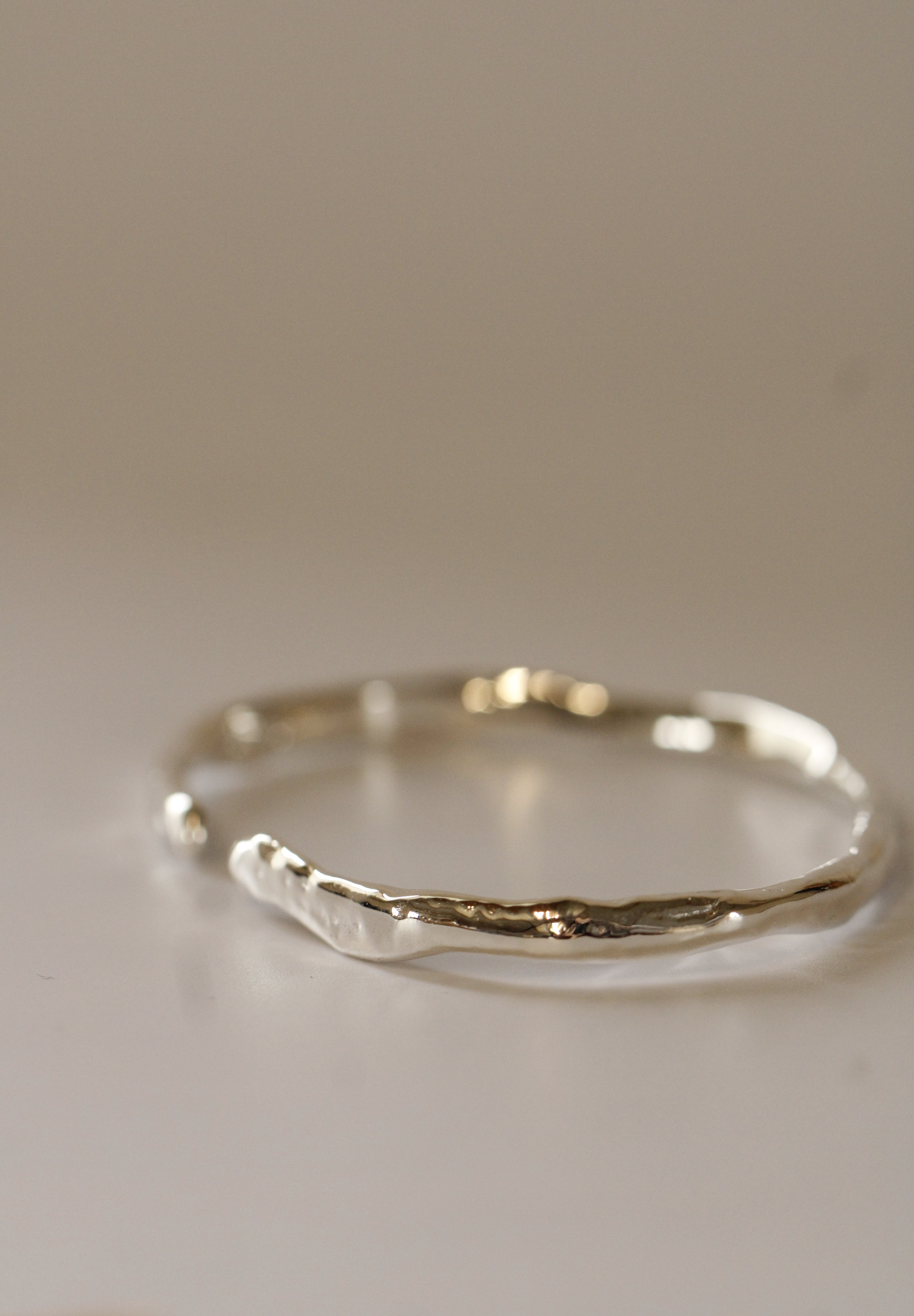Each bangle begins its life in wax. Sculpted and melted by hand, creating organic textures and unique contours that can never be replicated. The wax form is then cast into solid sterling silver, preserving every ripple and curve from the original handmade process.