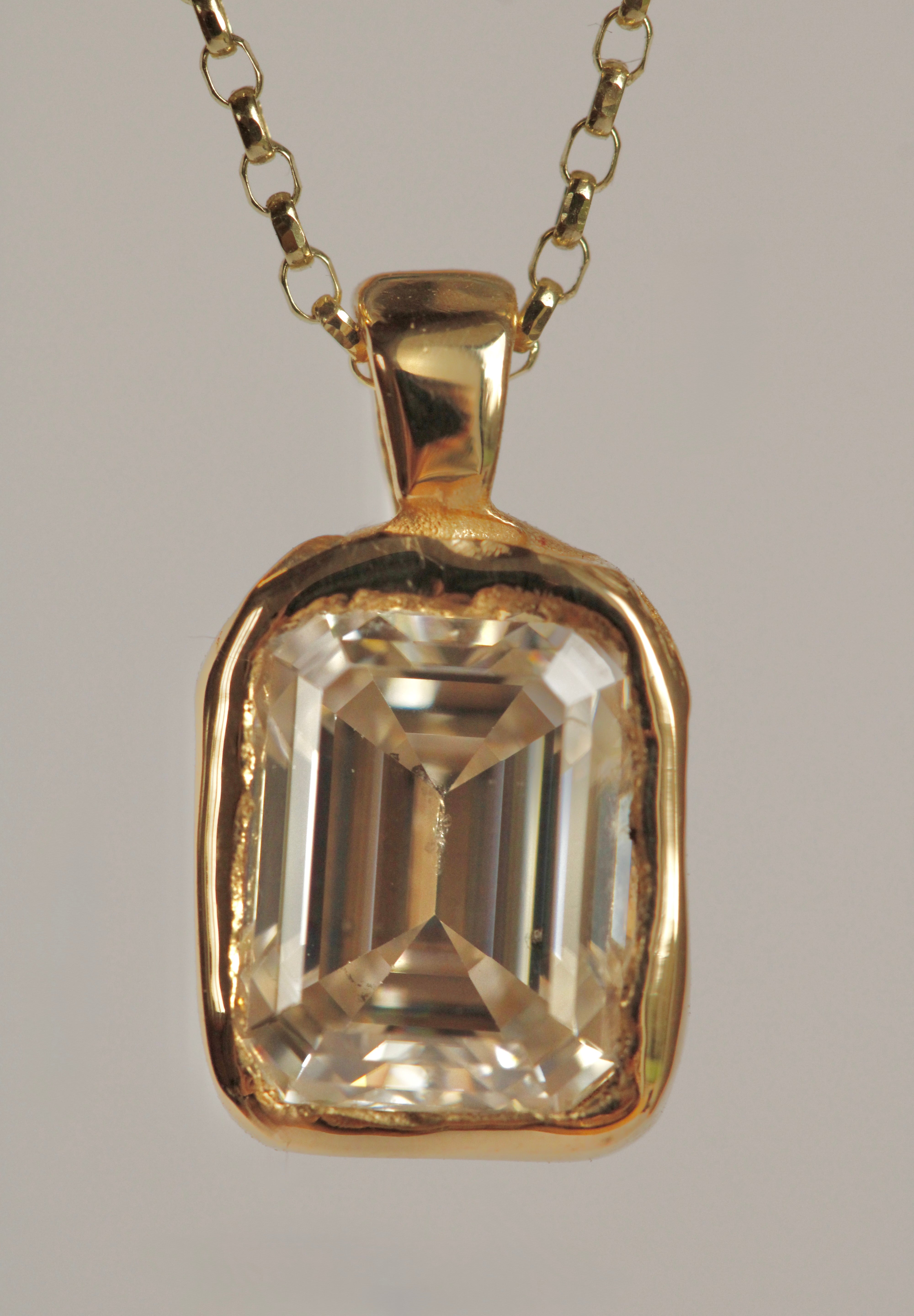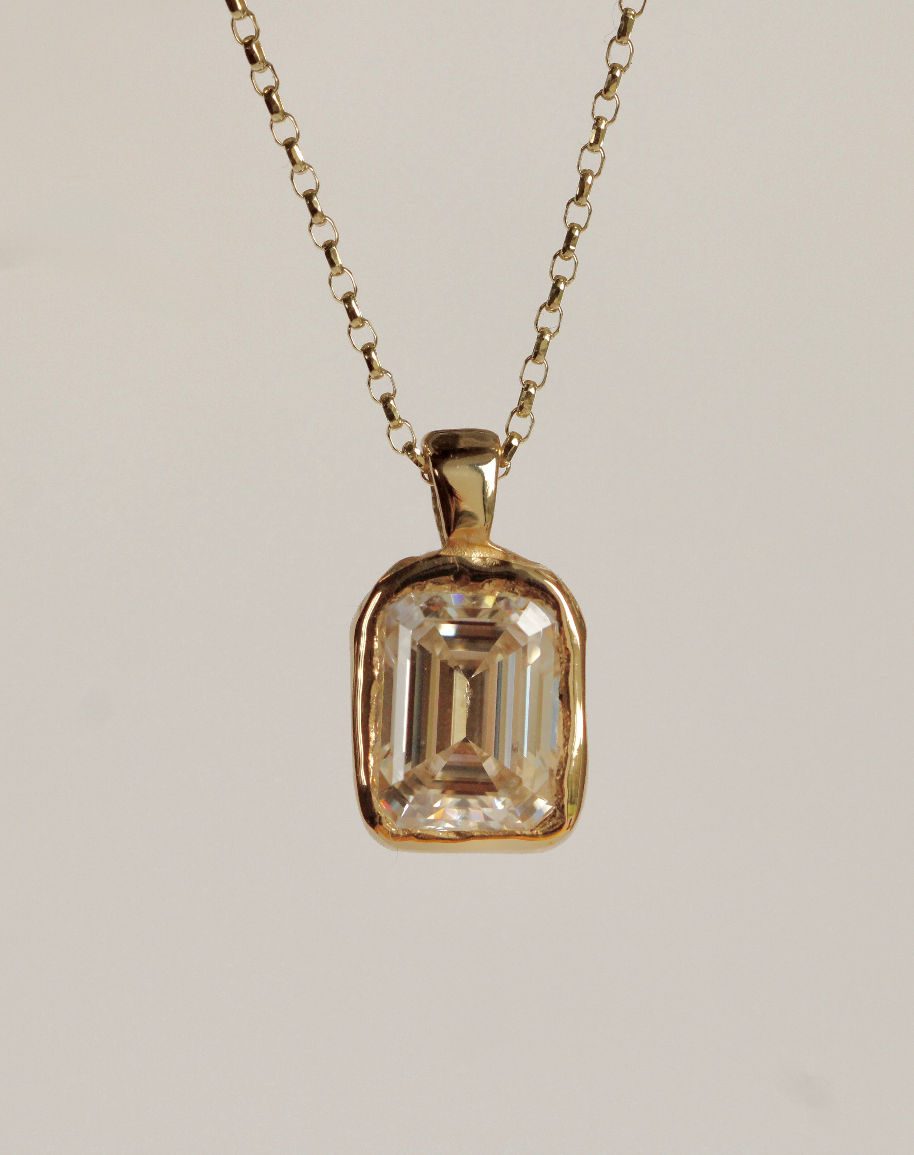 This organic 7x9mm emerald cut necklace is handcrafted in the metal of your choice, sculpted with a natural, soft textured finish. The setting has an understated, tactile quality that reflects the light beautifully, giving the piece a refined yet organic presence.