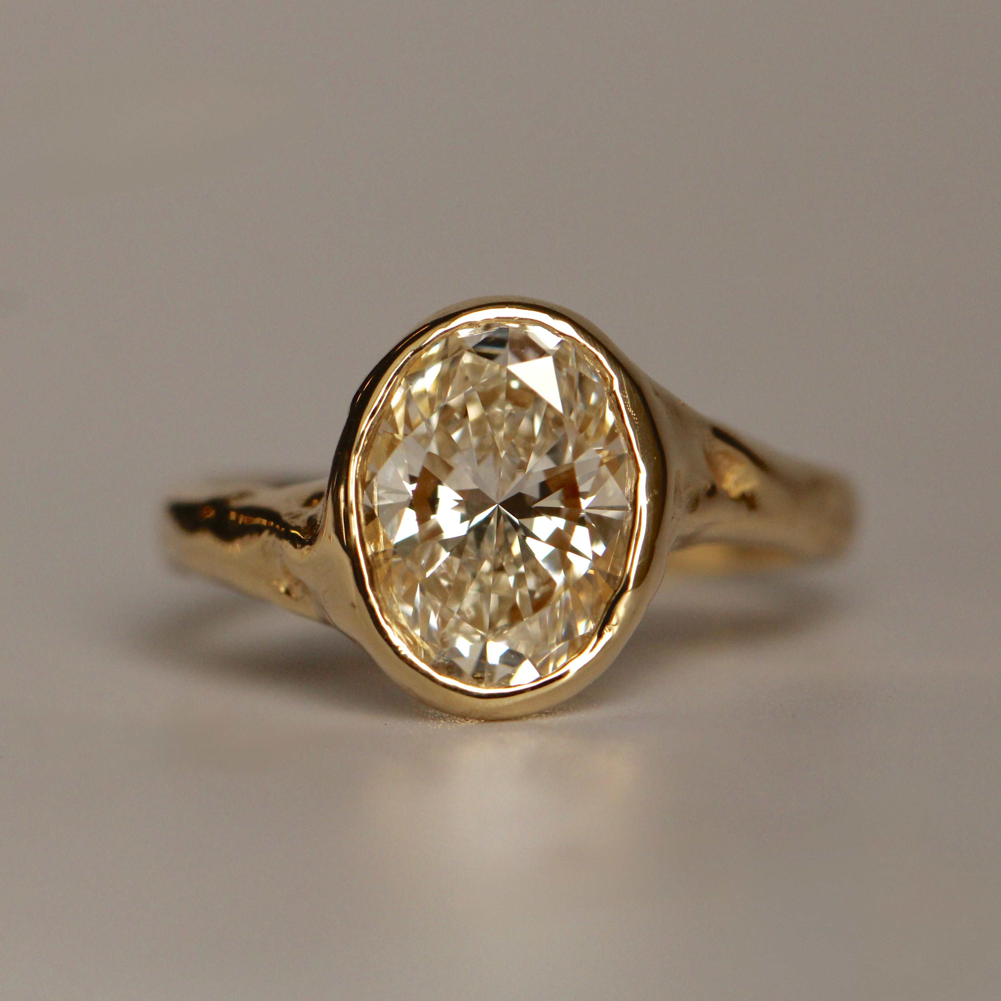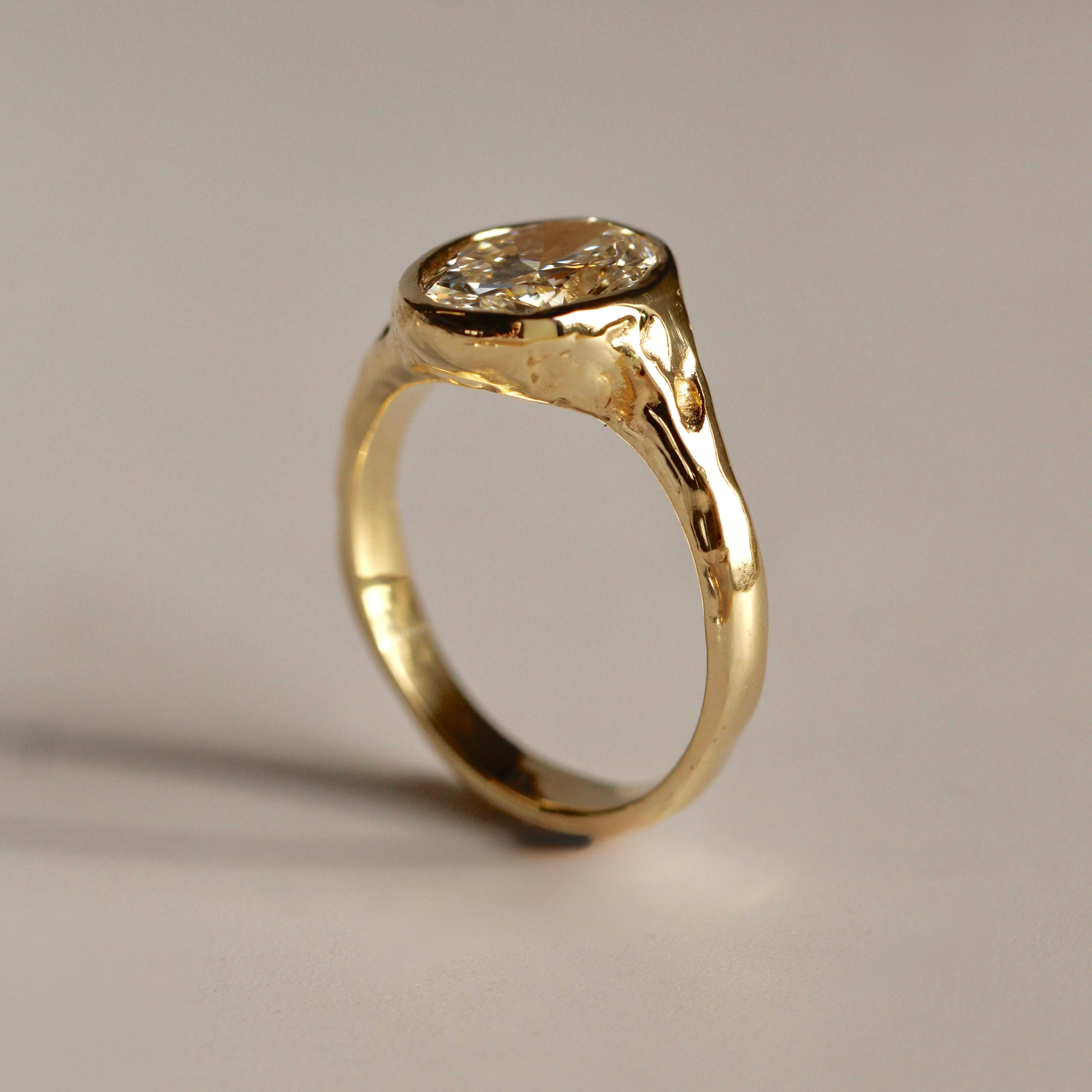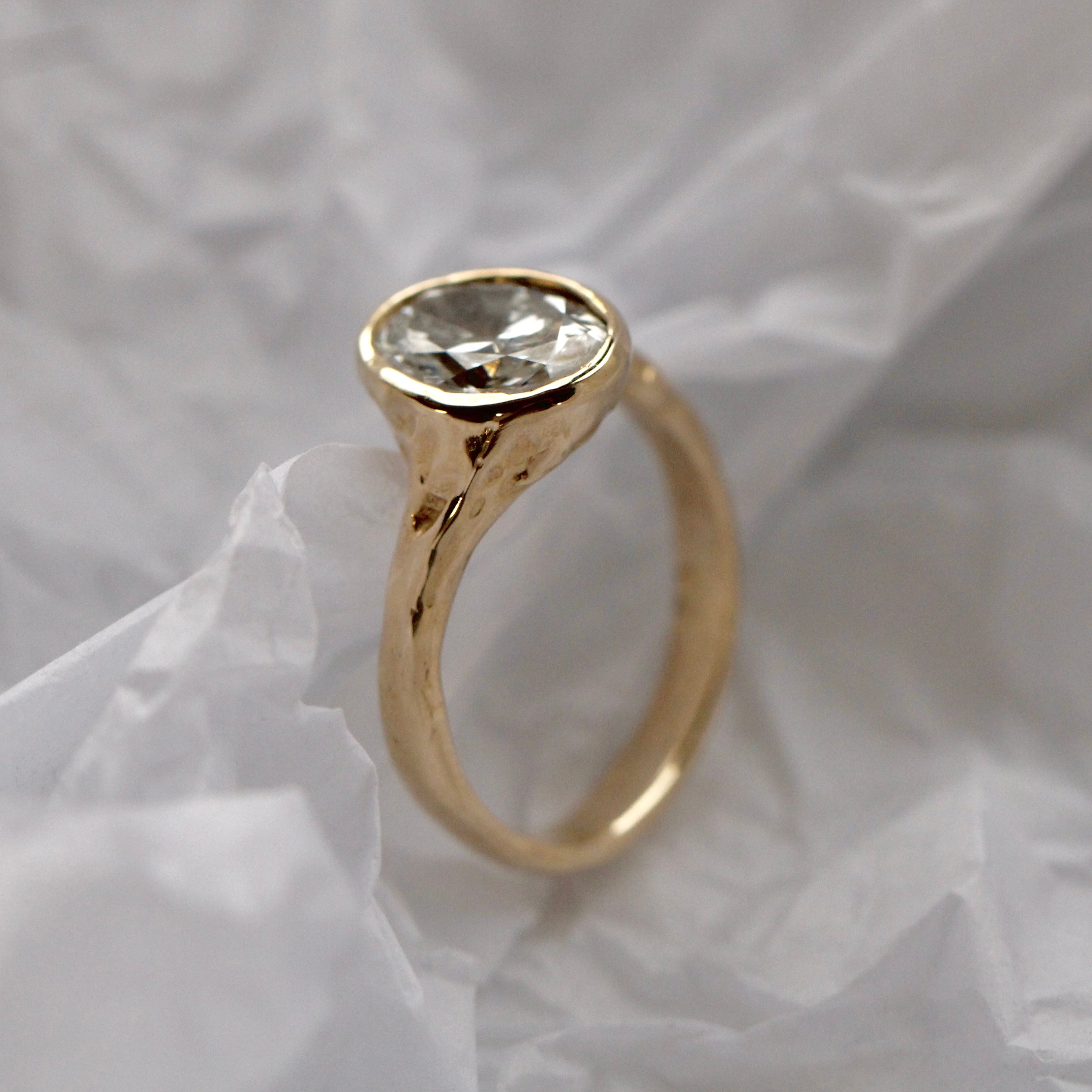 The Alba ring is meticulously handmade, defined by its softly carved form and natural, organic texture. At its centre sits a 9 x 7mm oval stone, carefully set to maximise light and emphasise its brilliance. The fluid detailing of the band contrasts with the clean symmetry of the oval cut, resulting in a design that feels both sculptural and refined. Elegant and enduring, Alba is designed to be worn and treasured for a lifetime.