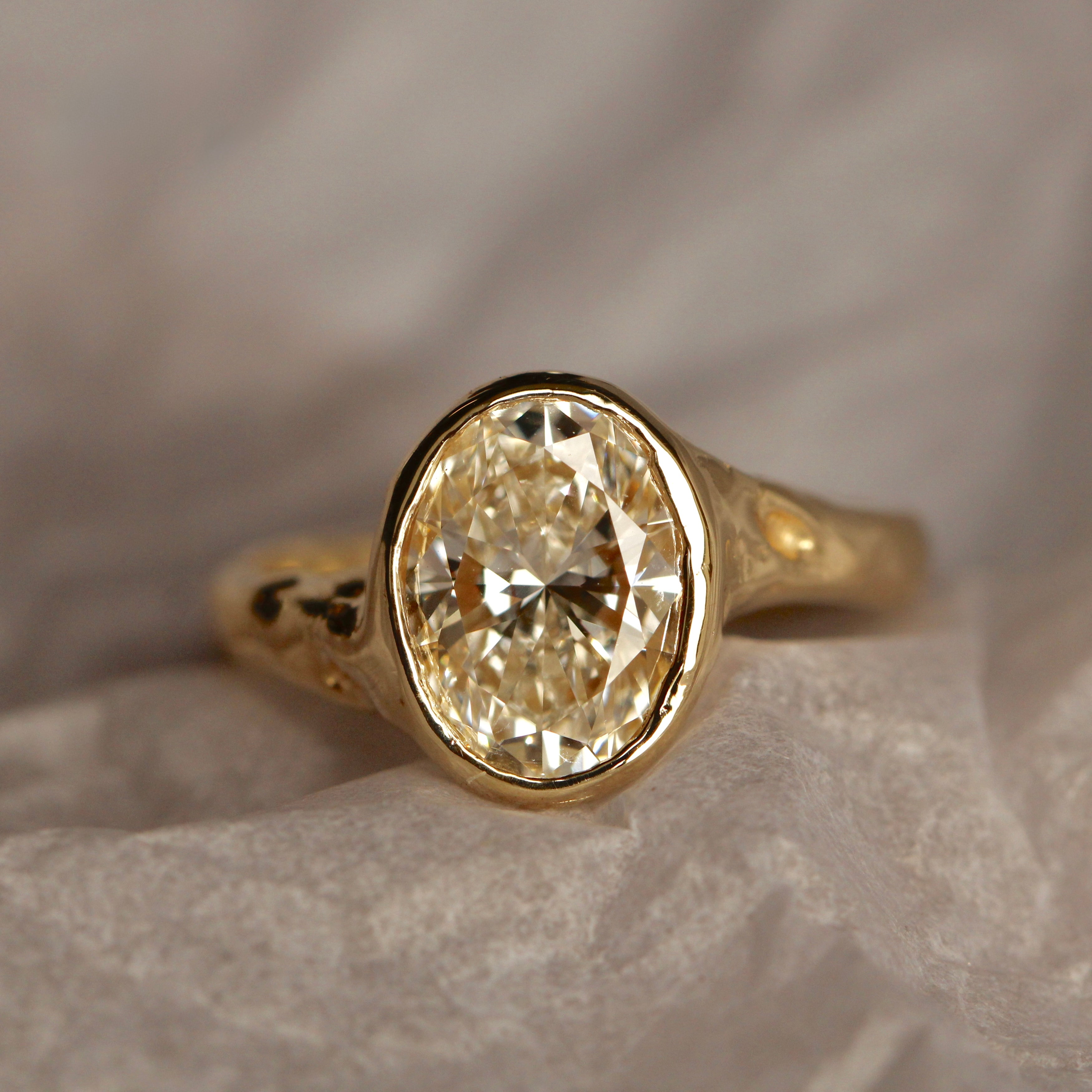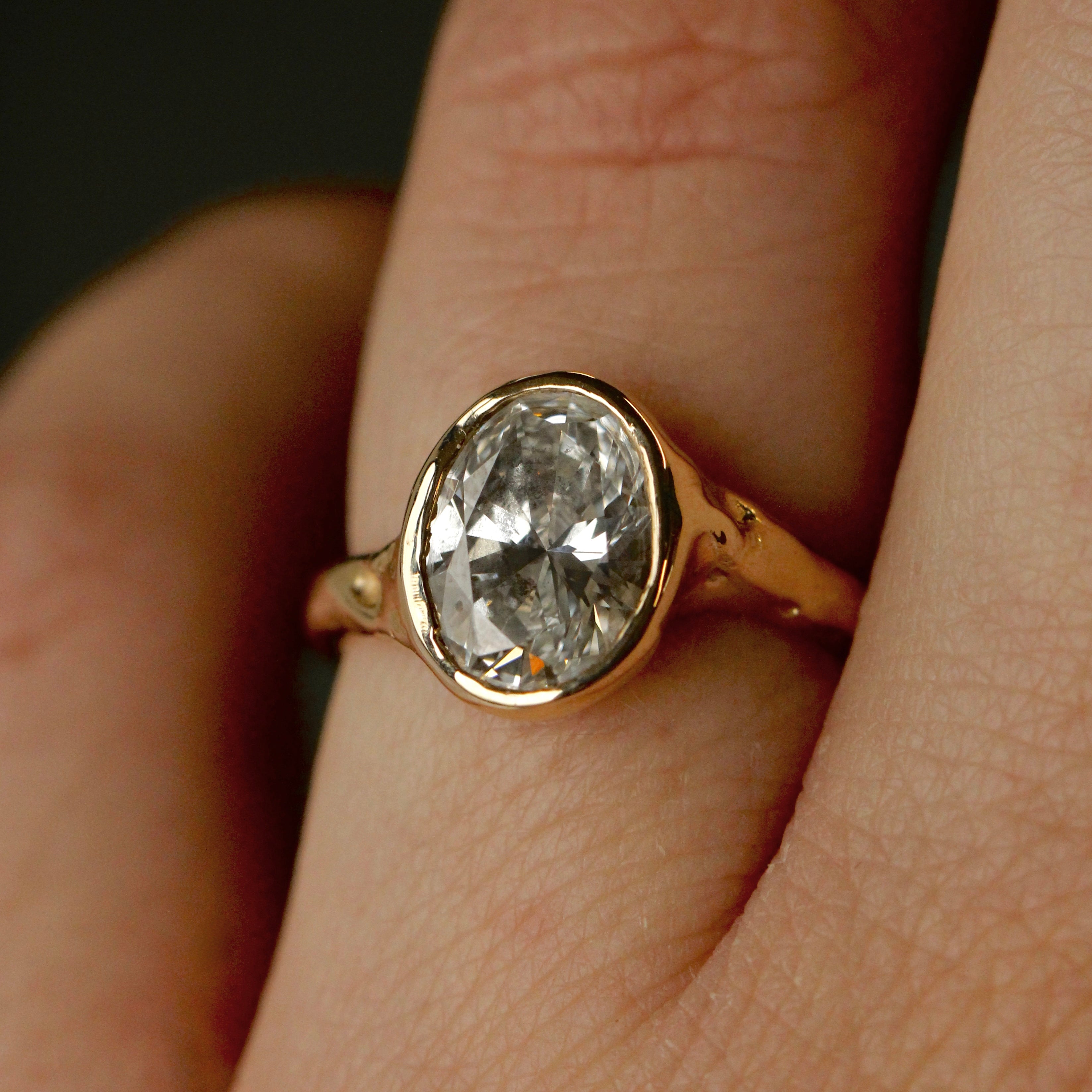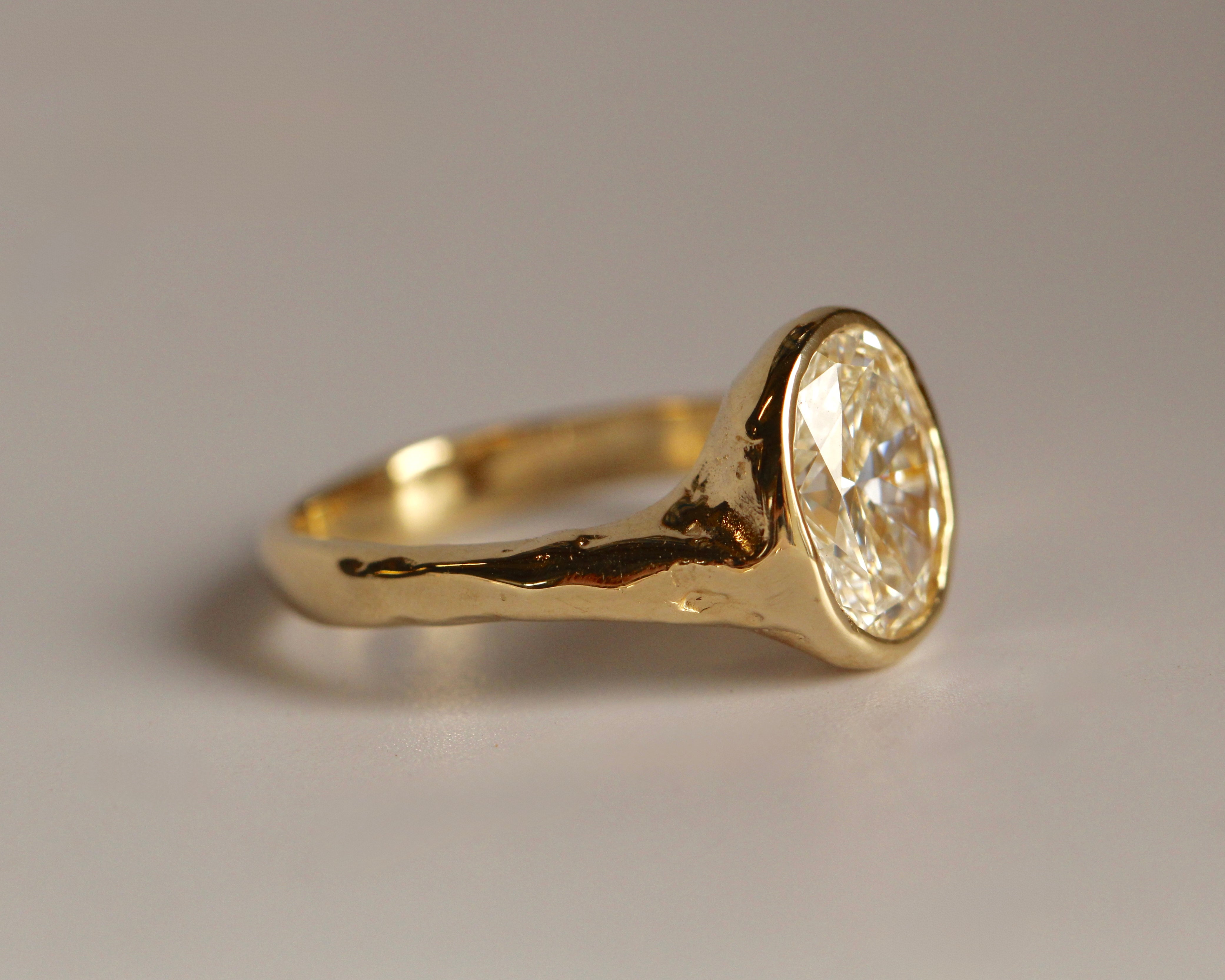 The Alba ring is meticulously handmade, defined by its softly carved form and natural, organic texture. At its centre sits a 9 x 7mm oval stone, carefully set to maximise light and emphasise its brilliance. The fluid detailing of the band contrasts with the clean symmetry of the oval cut, resulting in a design that feels both sculptural and refined. Elegant and enduring, Alba is designed to be worn and treasured for a lifetime.