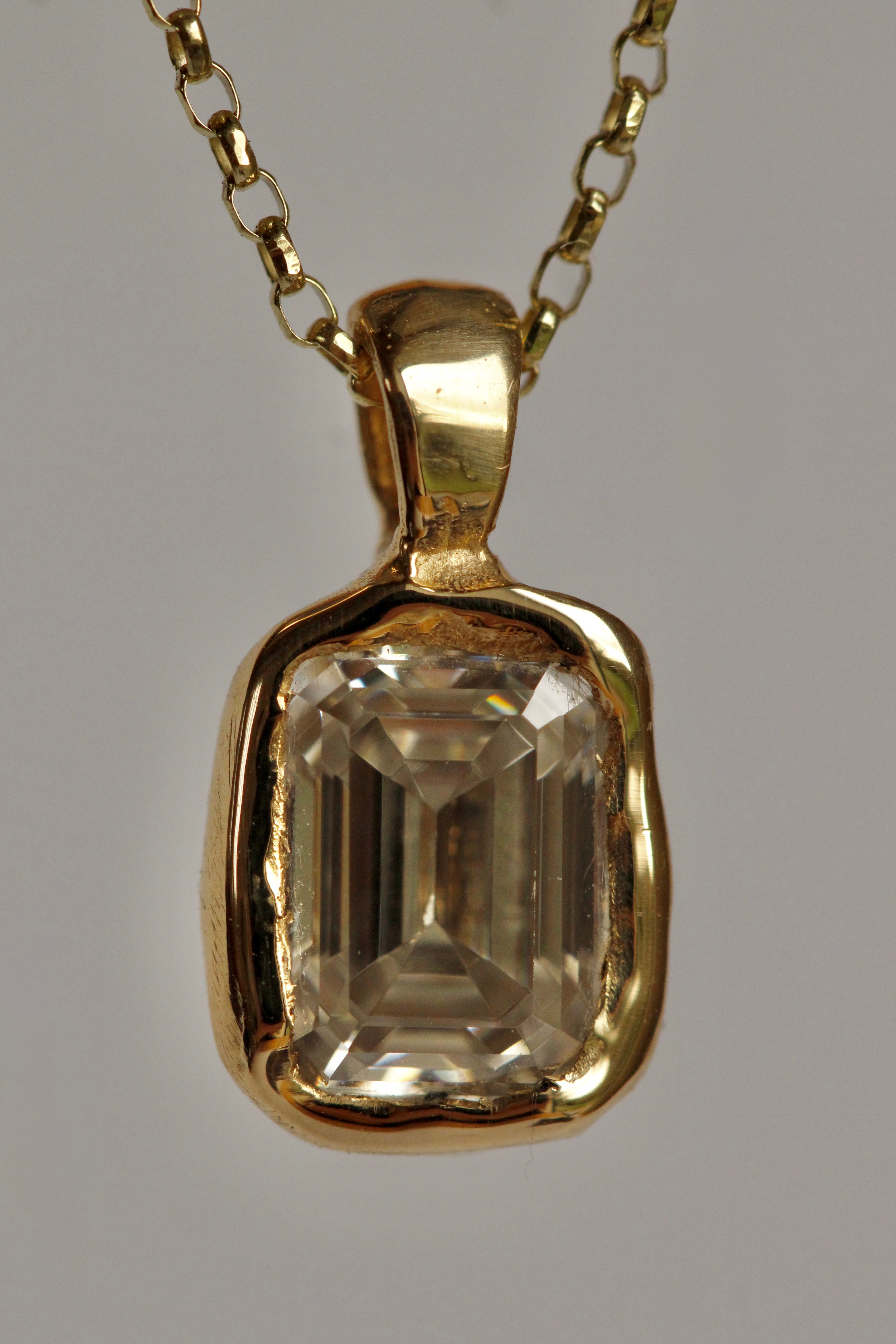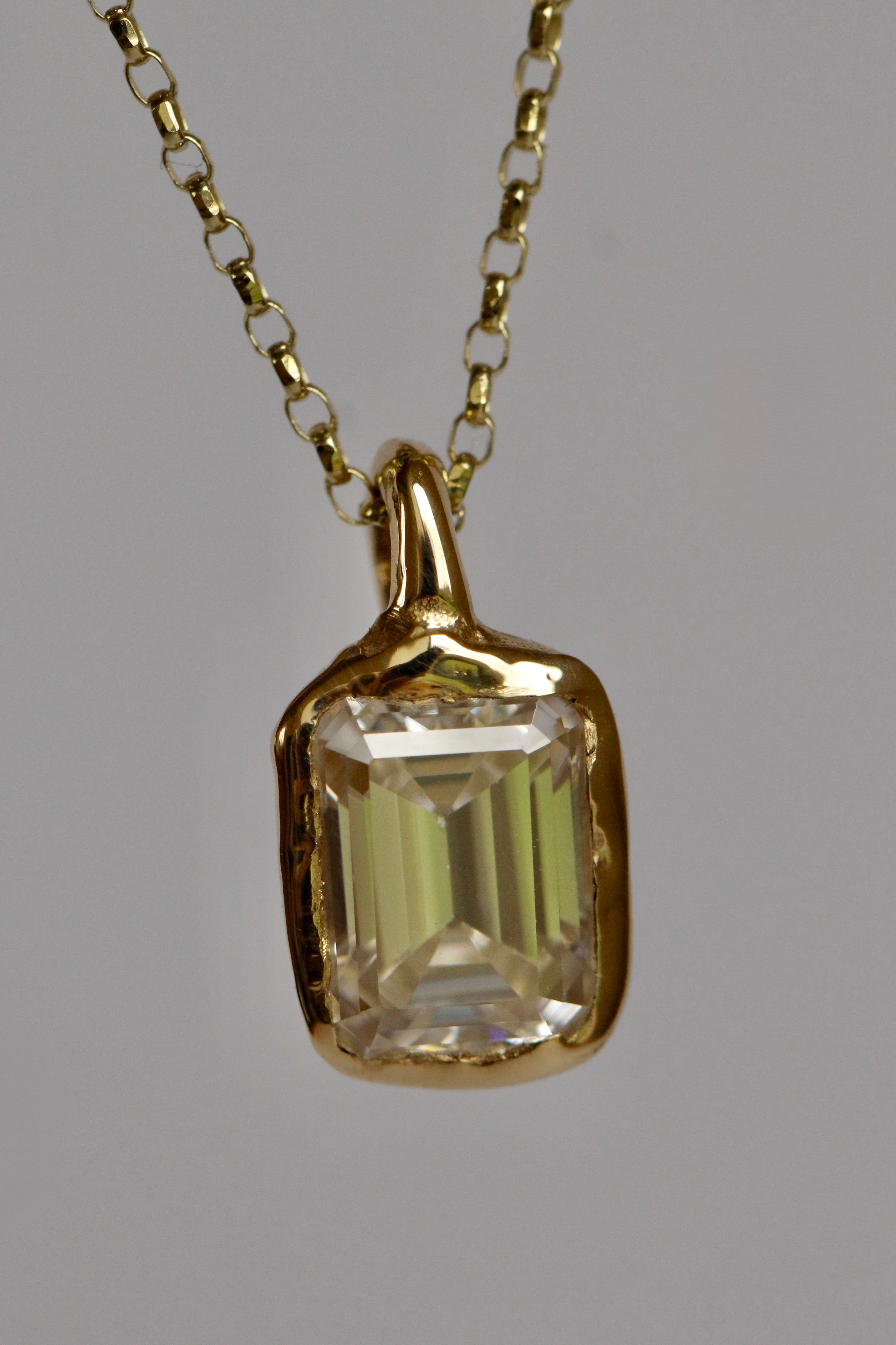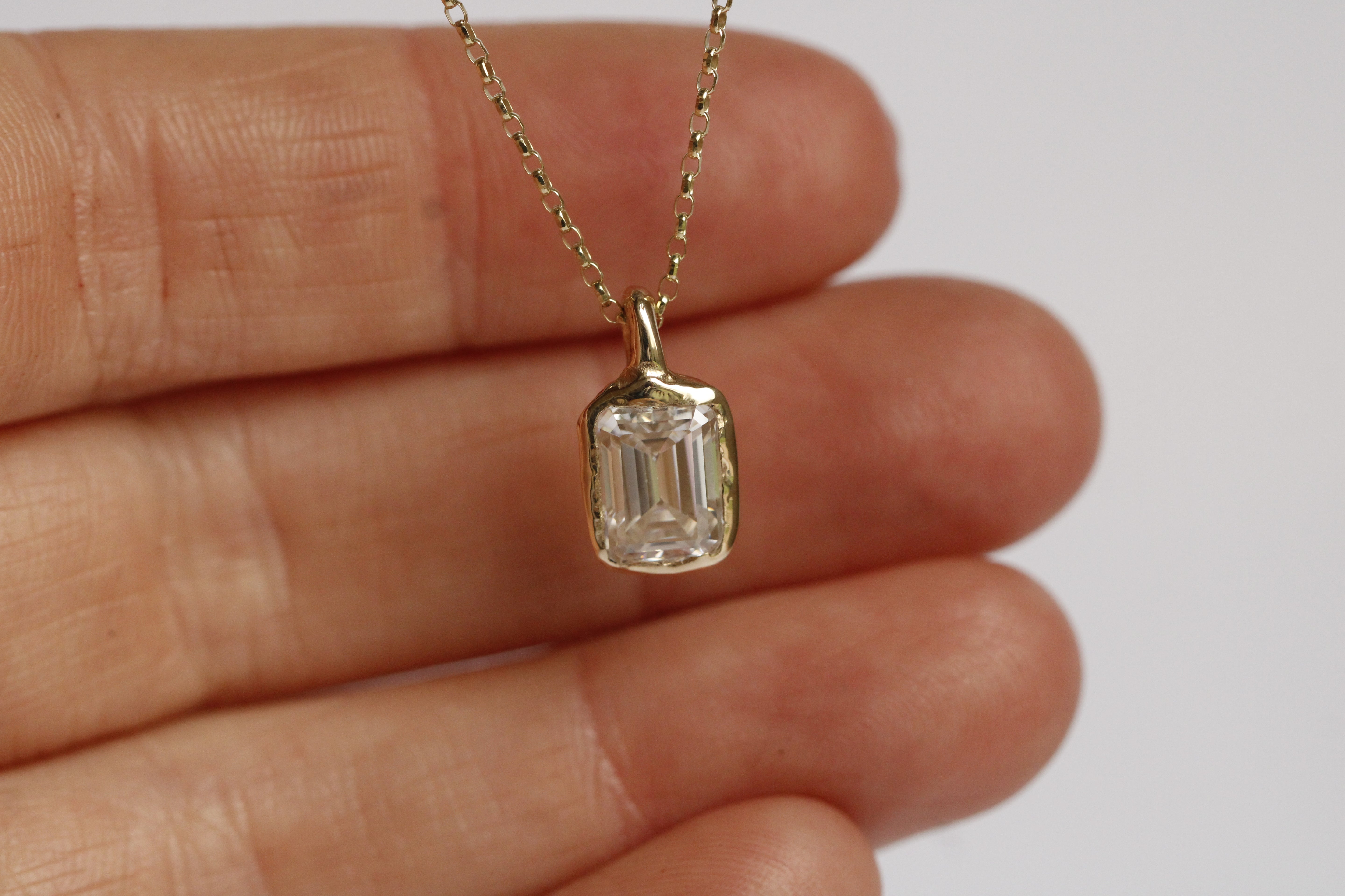 This organic 8x6mm moissanite necklace is handcrafted in solid 9ct gold, sculpted with a natural, soft textured finish. The setting has an understated, tactile quality that reflects the light beautifully, giving the piece a refined yet organic presence.